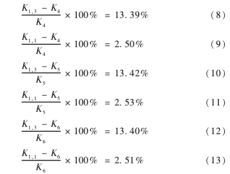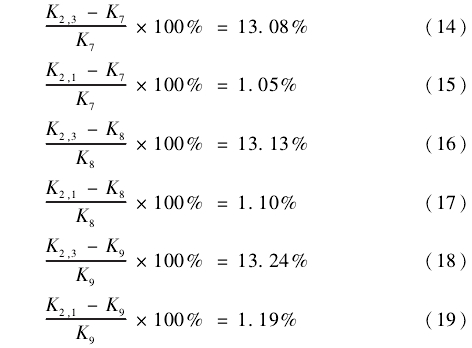 對2#電磁流量計在聚合物溶液中得到的儀器常數,與電磁流量計在自來水中得到的儀器常數進行對比分析。首先計算分析2#電磁流量計在3種不同黏度/濃度的聚合物溶液中得到的儀器常數K7、K8、K9,3個儀器常數相互之間差別很小,因此判斷2#電磁流量計響應規律受聚合物溶液濃度和黏度的影響很小,可以忽略不計。然后分別對2#電磁流量計在3種不同黏度/濃度的聚合物溶液中得到的儀器常數K7、K8、K9與2#電磁流量計在自來水中得到的包括層流和紊流兩種流態的儀器常數K2.3進行對比計算、與2#電磁流量計在自來水中得到的層流流態的儀器常數K2.1進行對比計算,得