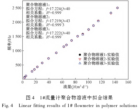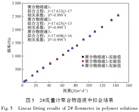 圖4為1#電磁流量計在0~200m³/d流量范圍,濃度分別為1000、1500、2000mg/L聚合物溶.液中的測量數據及線性擬合結果,將1#電磁流量計在3種聚合物溶液中得到的儀器常數(線性擬合曲線的斜率)分別記為K4=17.224、K5=17.219、K6=17.222。